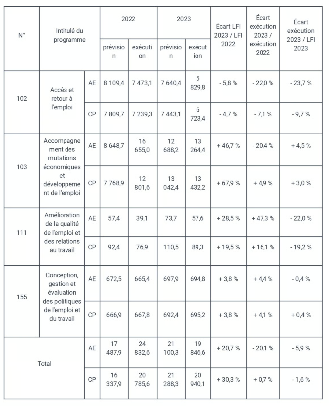 6. La mise en place de France Travail et la dynamique de l’alternance pèsent sur l’exécution 2023, comme en témoigne l’augmentation de la subvention pour charges de service public versée à Pôle emploi, ou encore le versement d’une subvention d’équilibre de 1,6 milliard d’euros à France compétences.